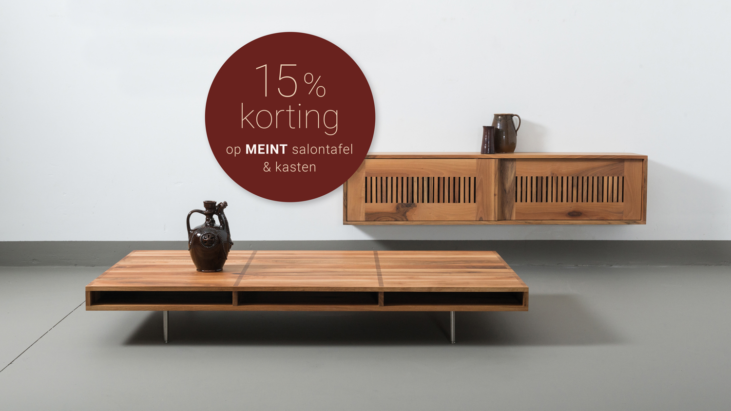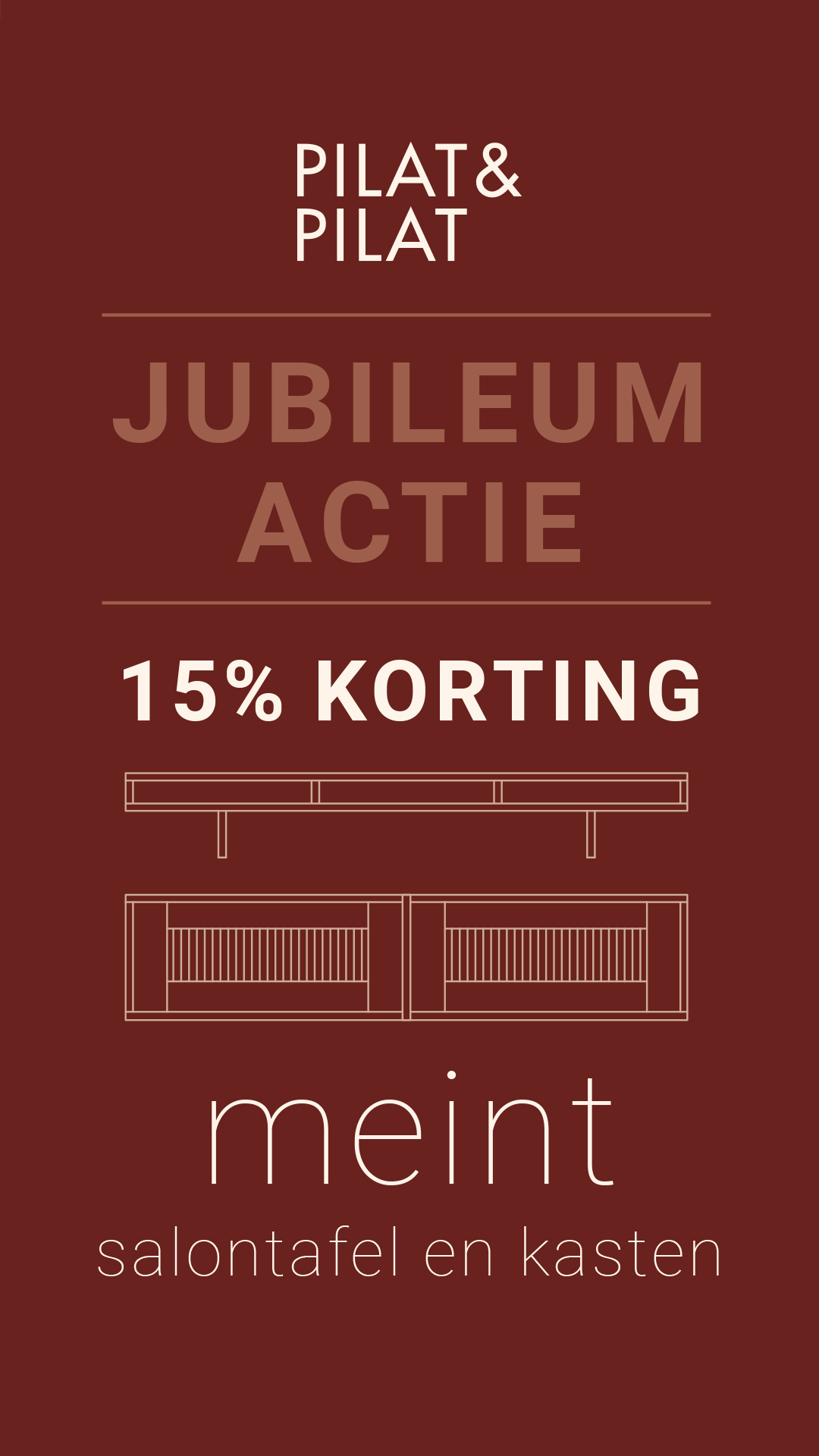 Omdat de Meint salontafel 30 jaar in de collectie is opgenomen krijgt u van 1 oktober 2025 tot en met 31 januari 2026 15% korting op de aankoop van een Meint salontafel, Meint hangkast of het Meint Rein dressoir. Verkrijgbaar in licht iepen, eiken of walnoot. Kom langs in onze showroom in Twijzel of ga naar een dichtsbijzijnde Pilat&Pilat dealer en vraag naar de mogelijkheden.