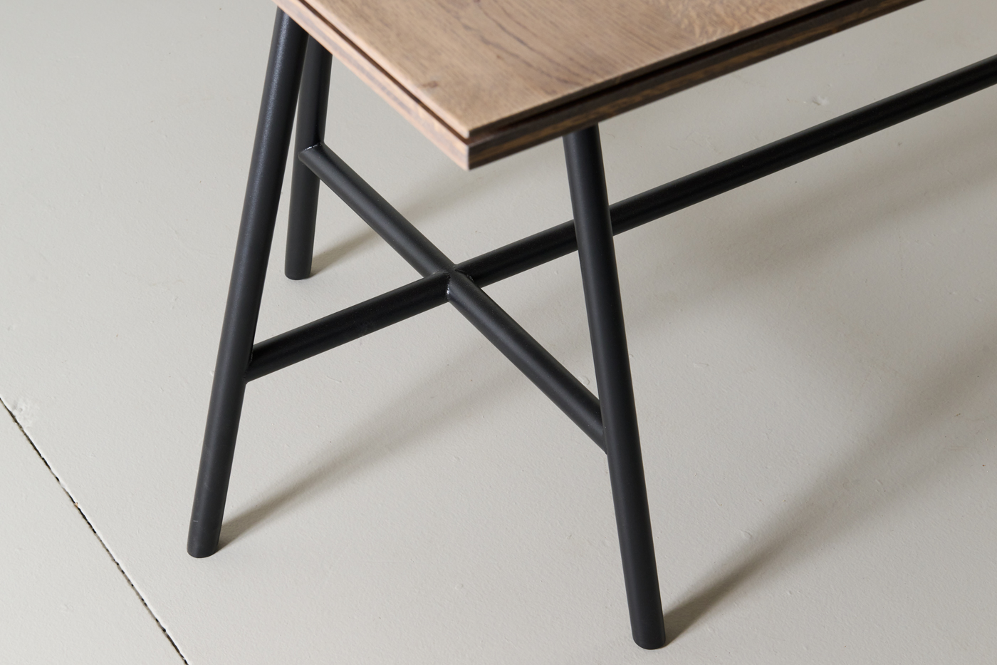 This table top gives Djurre its own face. The three cm thick table top is made up of five layers. The top layer seems to come loose from the top due to the profiling of the edges. With the wood grain in the transverse direction of the table top, the Djurre with a rectangular table top is a bit stubborn.