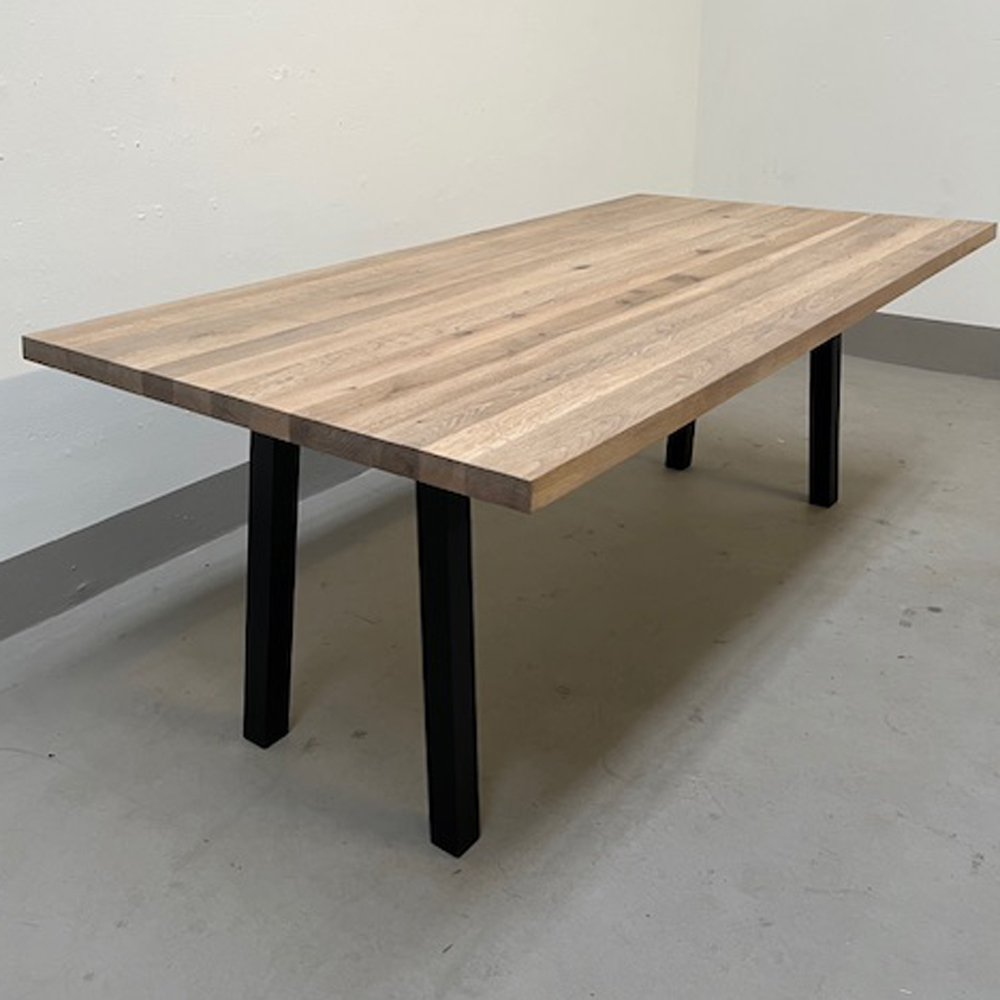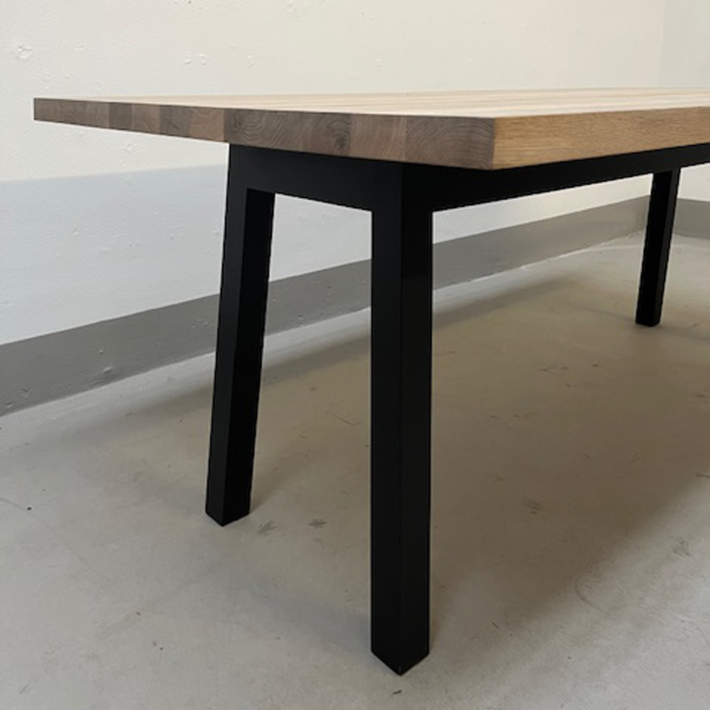 Wybe tafel met langshouten tafelblad. Het tafelblad is uitgevoerd in gerookt eiken en is afgewerkt met zeep. Het onderstel is gespoten in RAL 9004, houtnerf nog zichtbaar. Afmetingen 200cm x 100 x 76cm hoog. Geheel zonder krasjes en deukjes. Direct mee te nemen of bezorging tegen betaling en in overleg.